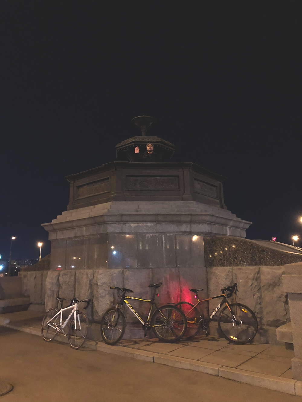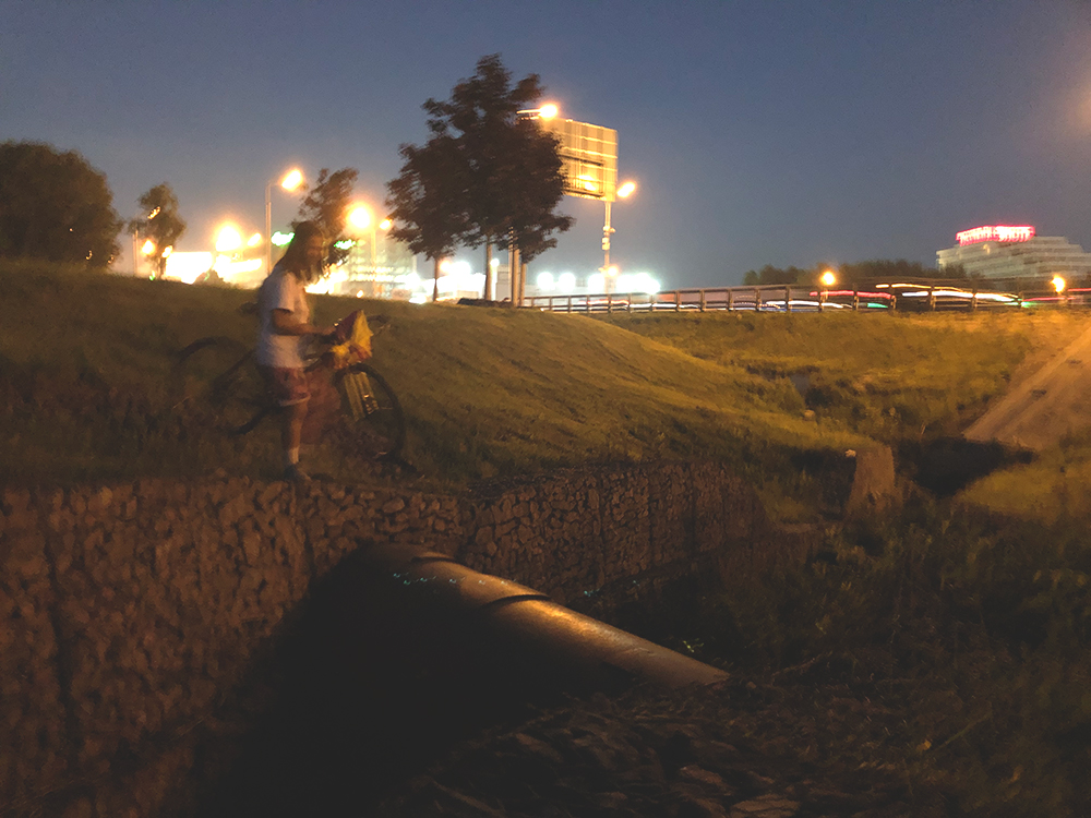 Произведение исполняется на велосипеде — это обеспечивает достаточный уровень плотности впечатлений и смену действий исполнителем. Маршрут не задуман как пеший, хотя ничто не может помешать исполнять его пешком в свободном темпе.